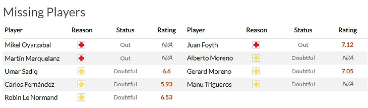 У гостей проблемы, в принципе, схожие. Лидер Подлодки Жерар Морено(8) будет ремонтироваться в сухом доке ещё несколько недель, зато его тезка Альберто Морено(5,5) наконец-то восстановился от тяжелой травмы и готов помочь Желтой субмарине.