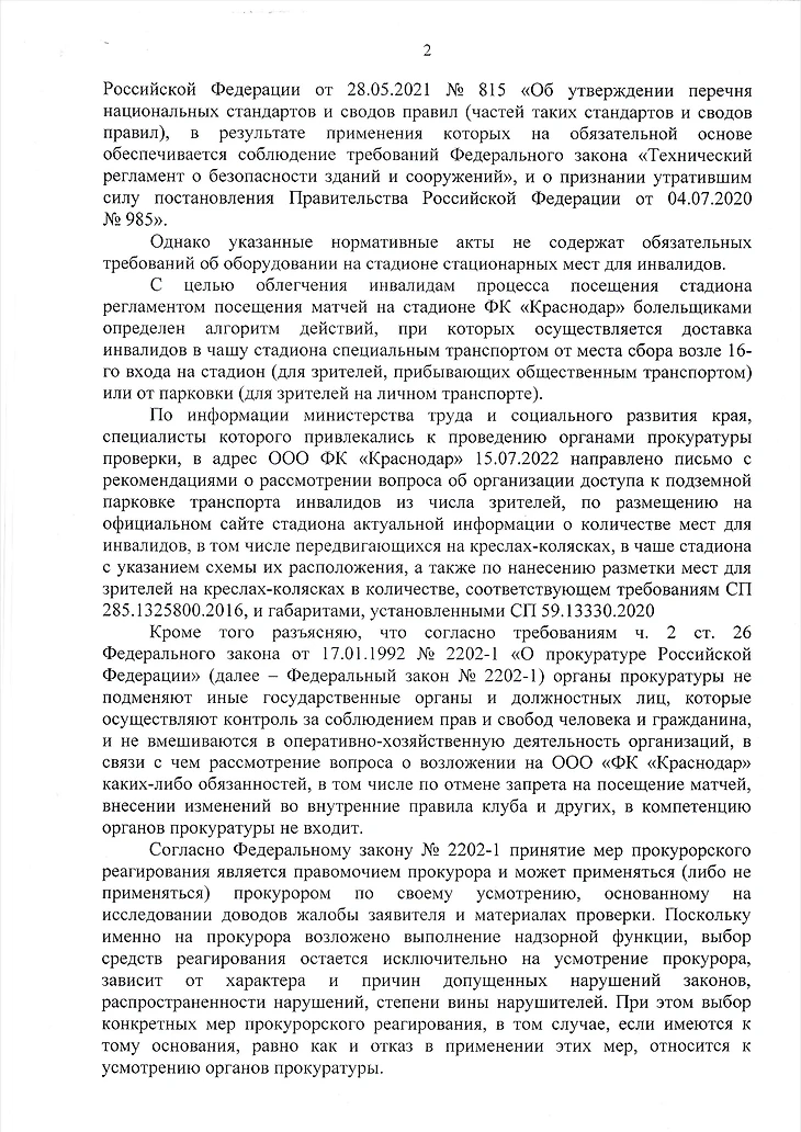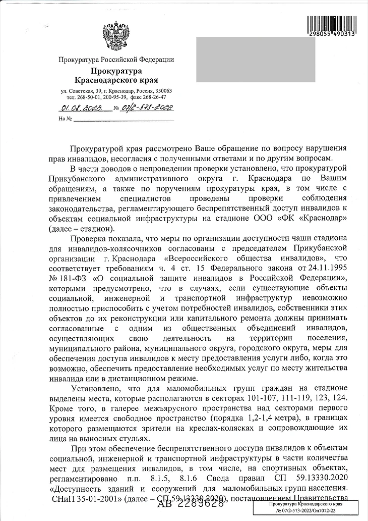 Колясочники зарегистрировали обращение в Генпрокуратуре РФ о нарушениях в деятельности ФК «Краснодар»