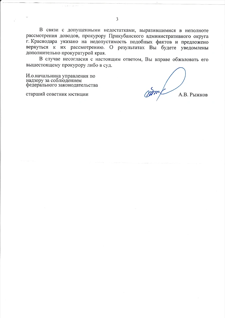 Ранее прокуратура Прикубанского административного округа г.Краснодара проводила не полную проверку деятельности клуба и не отвечала на все вопросы в обращениях колясочников, нарушая тем самым их конституционные права. Поэтому необходим контроль со стороны Генеральной прокуратуры Российской Федерации.
