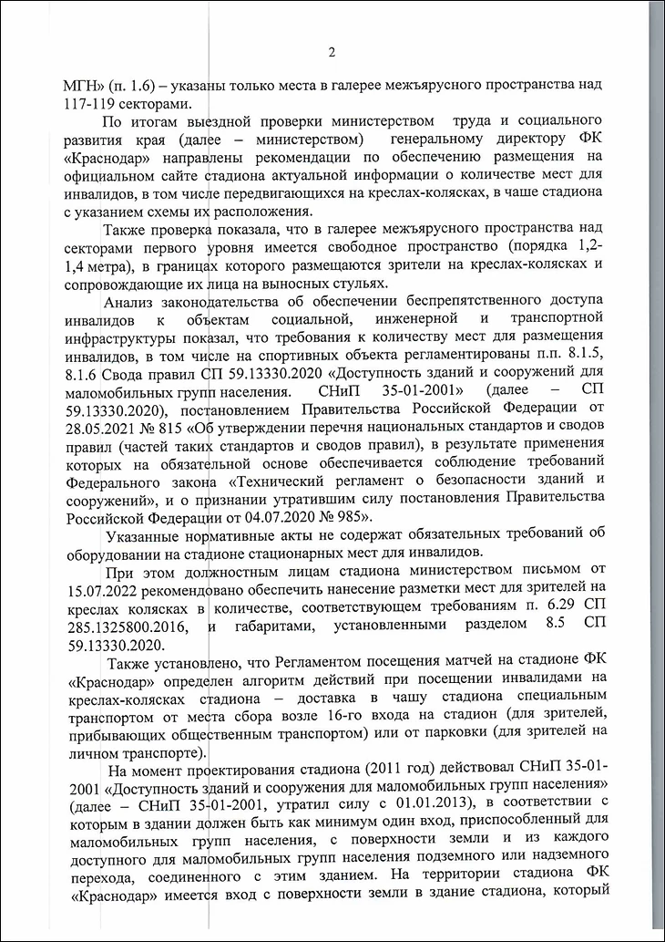 ФК «Краснодар» в настоящее время не выполнил эти рекомендации и не хочет мирно устранять все нарушения. В связи с этим, колясочники не могут чувствовать себя наравне со «здоровыми» и обязаны соблюдать множество правил, придуманных ФК «Краснодар», которых нет на других стадионах. Колясочники считают дискриминацией то, что у них отсутствует возможность просто взять и приехать на стадион, тогда когда им удобно, не использовать спецтранспорт и т.д.