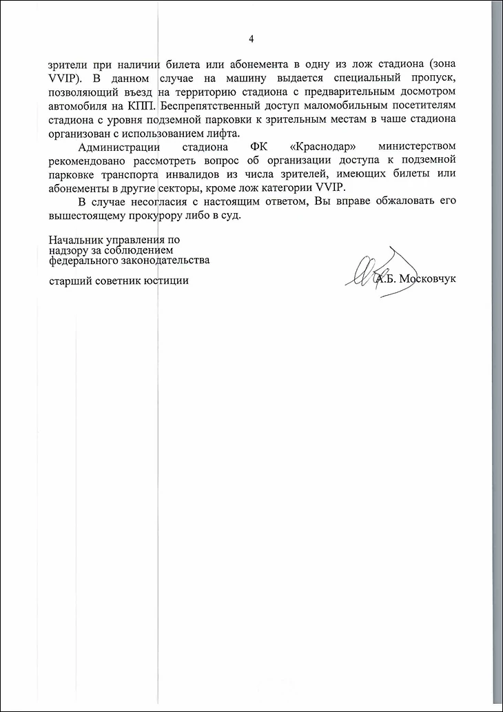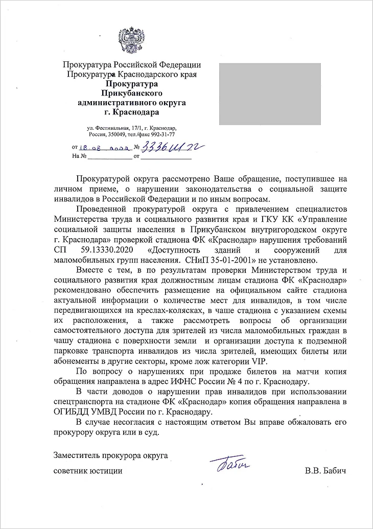Для устранения нарушений законов Российской Федерации семь колясочников, чьи права были нарушены на стадионе ФК «Краснодар», попросили прокуратуру подать в суд на клуб от их лица в соответствии со статьей 45 ГПК РФ.