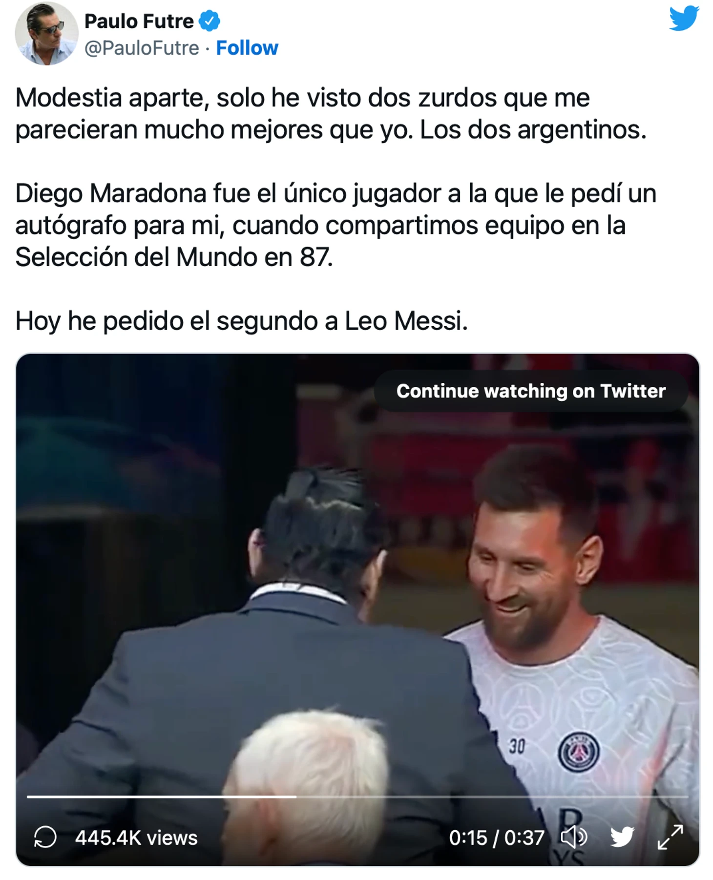 «Диего Марадона был единственным игроком, которого я просил дать автограф. Это было, когда мы выступали за сборную мира в 1987 году», - написал Футре в Твиттере.