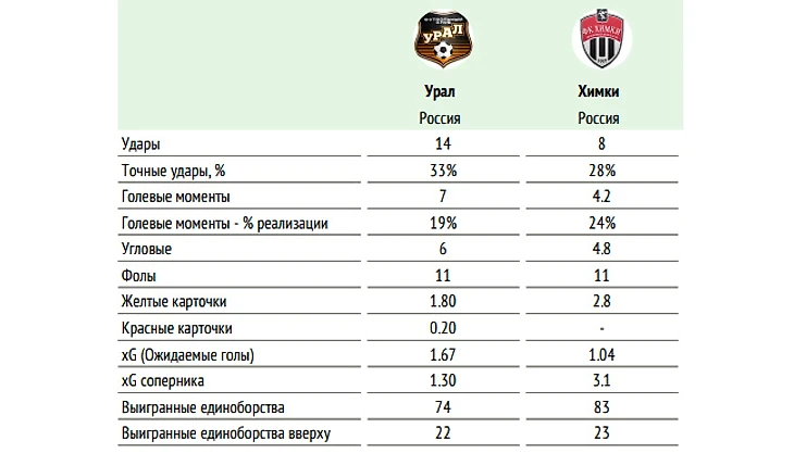 🕮 Факты: ◉ В 11 проведенных турах у «Урала» лишь одна ничья. ◉ Дома «Урал» не играет вничью 11 матчей РПЛ. ◉ Безвыигрышная серия «Химок» в чемпионате России длится семь туров. По ходу неё подмосковная команда набрала лишь одно очко из 21 возможного. ◉ В гостях «Химки» пропускают восемь матчей подряд. ◉ «Химки» - худшая команда сезона по игре в первых таймах, в них она не одержала ни одной победы, набрав лишь 3 очка из 33 возможных. ◉ «Химки» не могут выиграть в гостях первый тайм 17 матчей подряд. ◉ «Химки» не пропускают в матчах с «Уралом» 293 минуты. ◉ Первый мяч, забитый «Уралом» в этом матче, станет для уральцев пятисотым в высшей лиге чемпионата России.