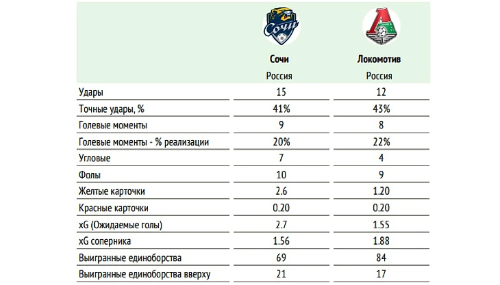 = Баланс матчей «Сочи» и «Локомотива» в чемпионатах России: суммарный: +1=2-3, мячи 6:9 на поле «Сочи»: +1=1-1, мячи 4:4 последние три матча «Сочи» и «Локомотива» на поле «Сочи» – 0:1, 2:1, 2:2