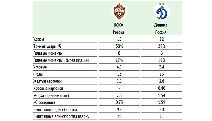 = Баланс матчей ЦСКА и «Динамо» в чемпионатах России: суммарный: +19=18-23, мячи 78:78 на поле ЦСКА: +8=10-12, мячи 38:40 последние пять матчей ЦСКА и «Динамо» на поле ЦСКА – 1:2, 2:2, 0:1, 3:1, 1:0