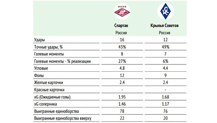 = Баланс матчей «Спартака» и «Крыльев Советов» в чемпионатах России: суммарный: +39=9-6, мячи 111:42 на поле «Спартака»: +20=5-2, мячи 56:15 последние пять матчей «Спартака» и «Крыльев Советов» на поле «Спартака» – 1:0, 1:0, 3:1, 2:0, 2:1.