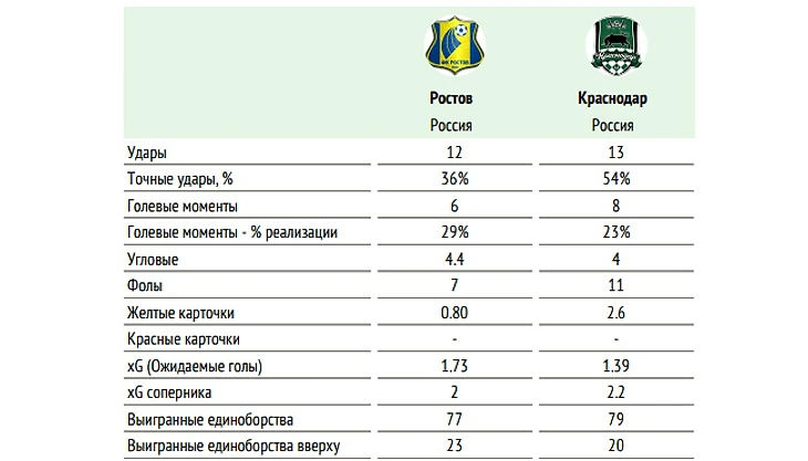 = Баланс матчей «Ростова» и «Краснодара» в чемпионатах России: суммарный: +1=12-11, мячи 22:36 на поле «Ростова»: +0=8-4, мячи 10:17 последние пять матчей «Ростова» и «Краснодара» на поле «Ростова» – 0:0, 1:1, 1:3, 1:1.