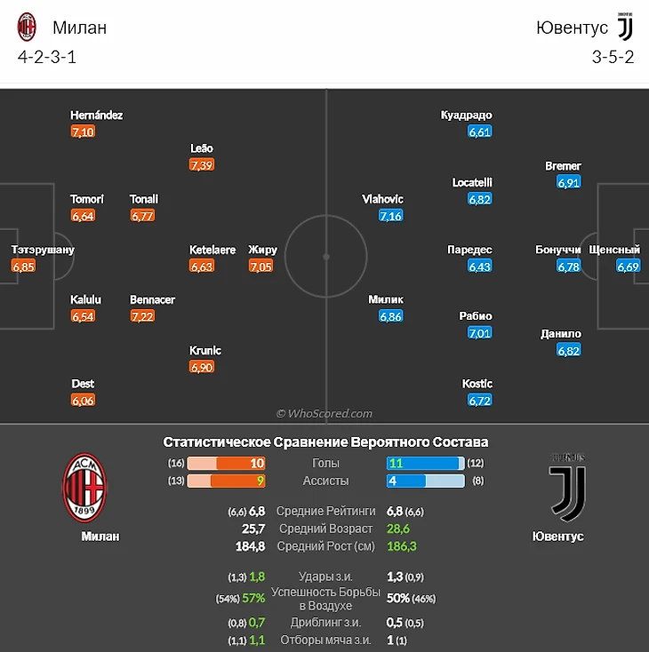На сегодняшний день обе команды в определенной степени хромают в чемпионате Италии. Милан выглядит куда увереннее, но травмы и спад формы не могли пройти незамеченными - на пять побед пришлось две ничьи и одно поражение. Но при этом миланцы успели встретиться с Наполи, Интером, Аталантой и Удинезе, поэтому результаты вполне приемлемы. У Ювентуса ситуация куда более плачевная - очки терялись в играх с Сампдорией, Ромой, Салернитаной, Монцей и Фиорентиной. Милан куда больше пропускает, но при этом и больше забивает.