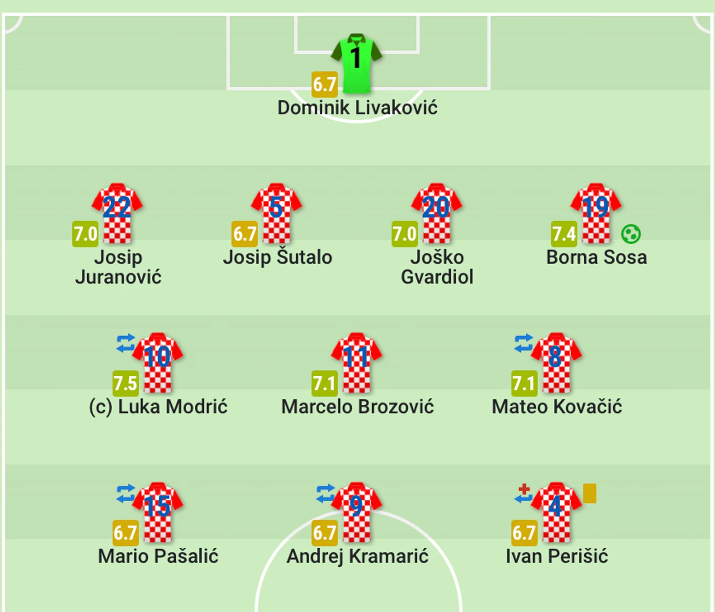 Схема игры сборной Хорватии: 4-3-3 (атакующая), реже 4-2-3-1.