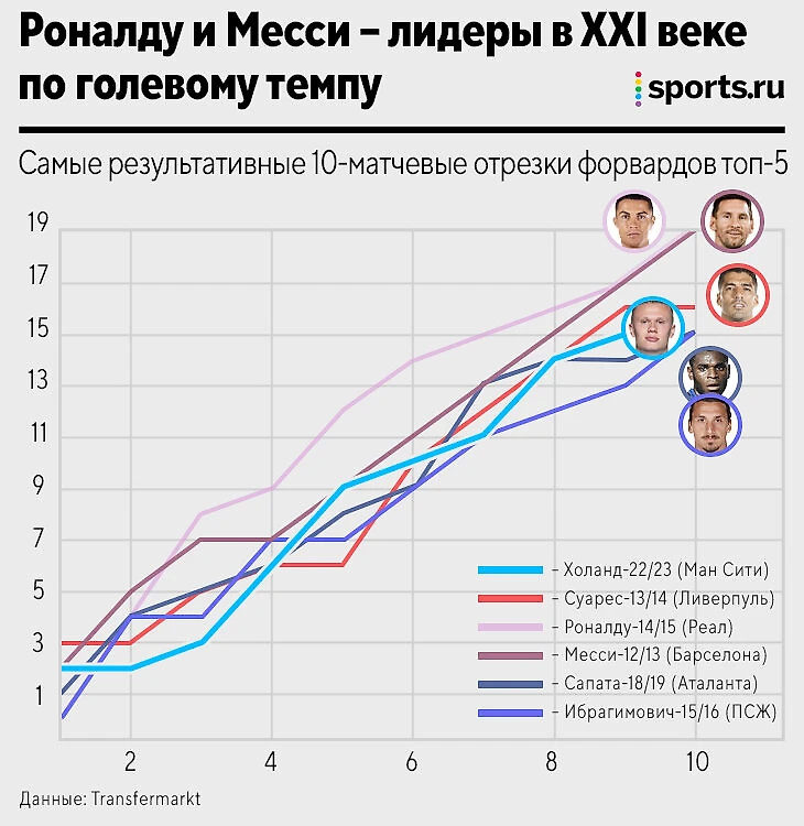 Темп Холанда не высочайший за всю историю, Месси и Роналду (с оговорками) шли мощнее