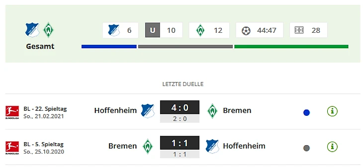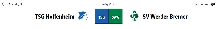 - «Хоффенхайм» проиграл только один из последних 11-и матчей лиги против «Вердера» - со счетом 1:0 дома в мае 2019 года благодаря голу Йоханнеса Эггештейна.