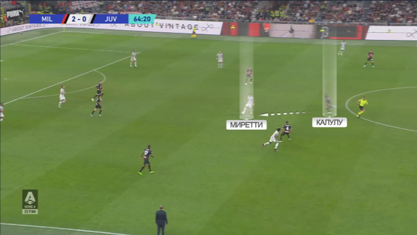Во-вторых, качественная реакция «Милана». Выделим два приема. Первый – защитники не боялись оставить позицию и сдержать того самого лишнего игрока. Здесь за Миретти выскочил Калулу – напомню, правый защитник в этом матче: