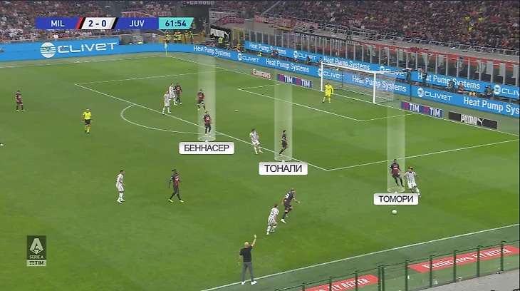Сами изменения были направлены на сдерживание контратак «Ювентуса», но символично, что оба гола пришли после потерь гостей в зоне, которую починил Пиоли. Момент перед вторым мячом – редкий случай, когда Леау все же отпустил Данило (решил поддавить Бремера, который неуклюже обработал мяч). Но тут хвалим Жиру – вовремя вернулся и подстраховал партнера, причем с подсказки Пиоли. Лишний раз подчеркнуло важность сдерживания Данило.