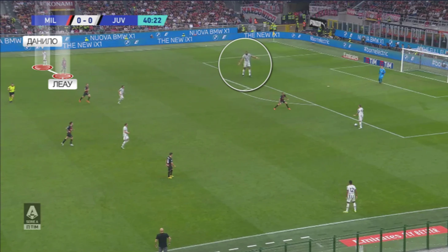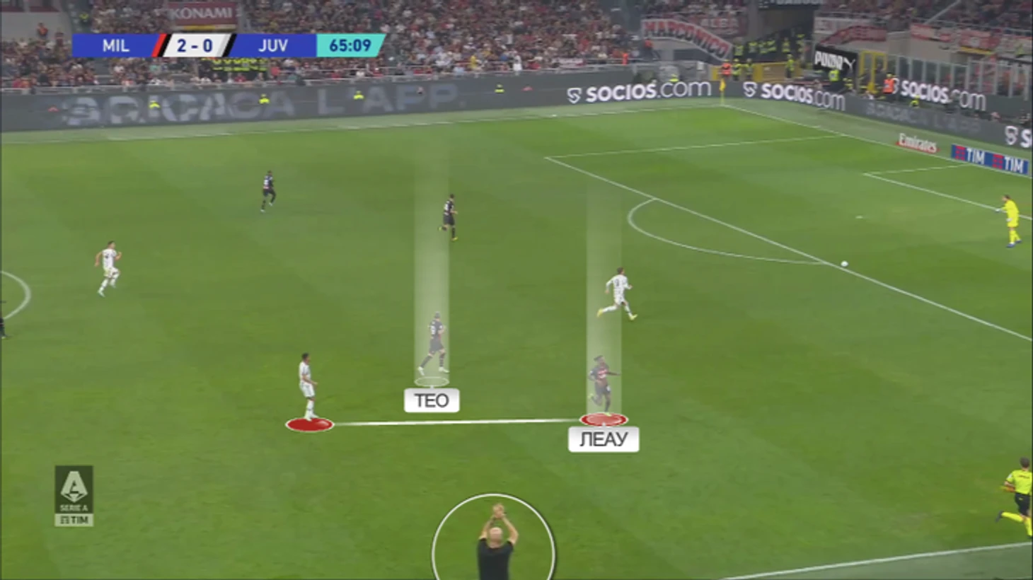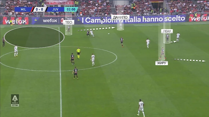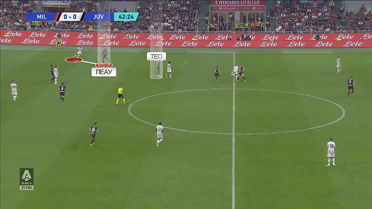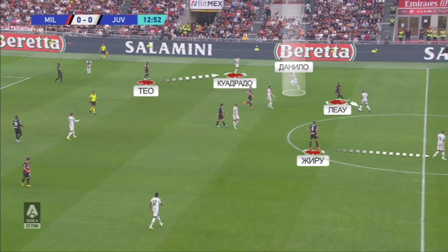 В прессинге Пиоли поменял роли Леау и Тео. «Милан» отказался от идеи давить на пару центральных защитников «Юве». Теперь по ним действовал только Жиру – Леау сразу откатывался к Данило. По цепочке перестал высоко выдвигаться и Тео – теперь француз мог сосредоточиться на Куадрадо: