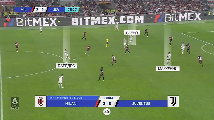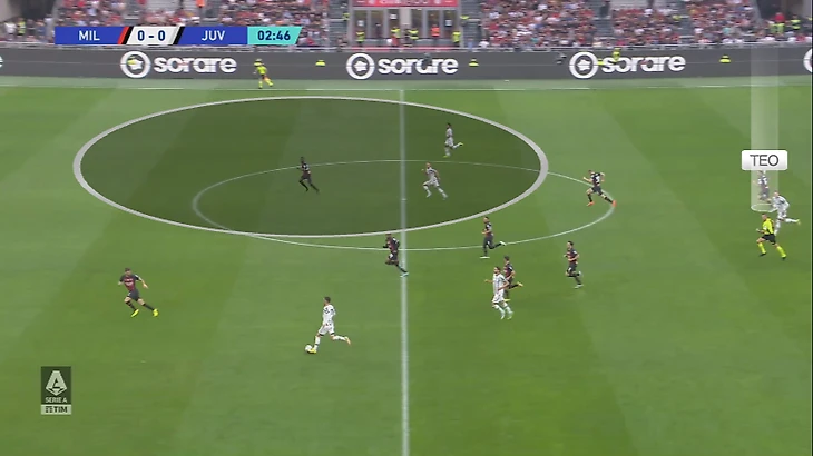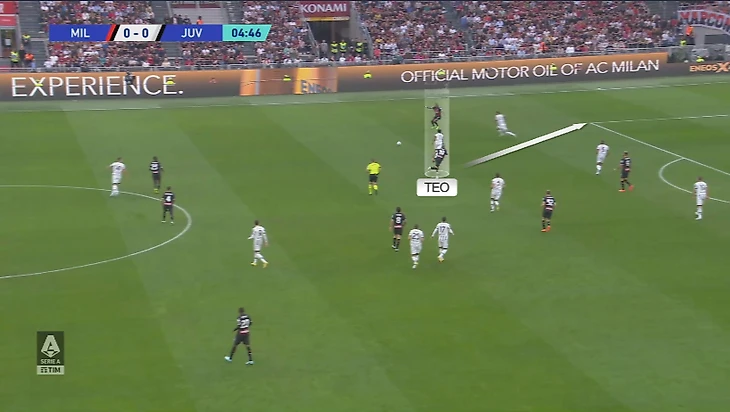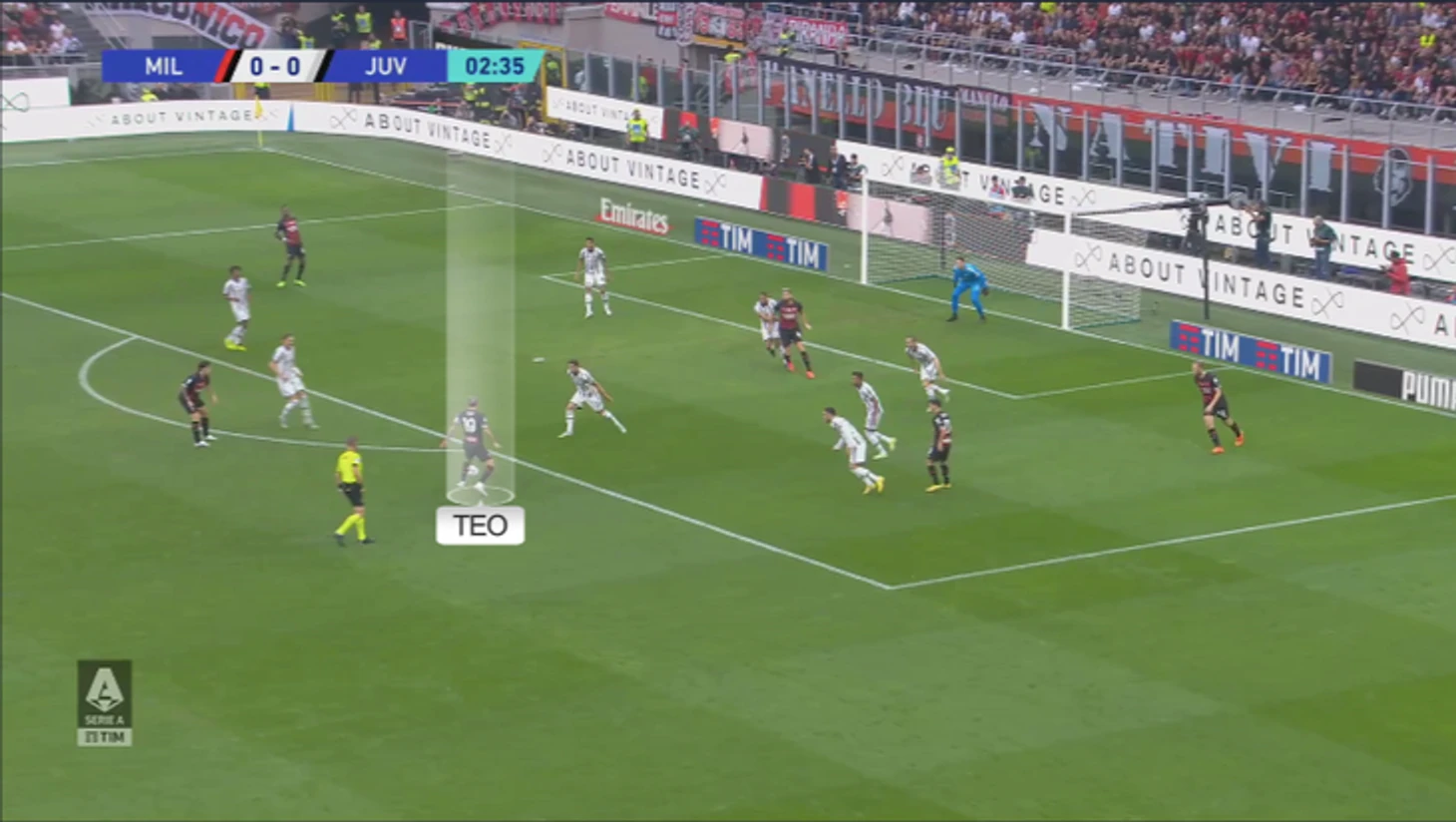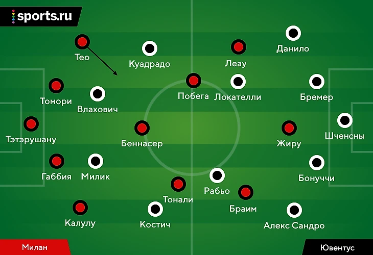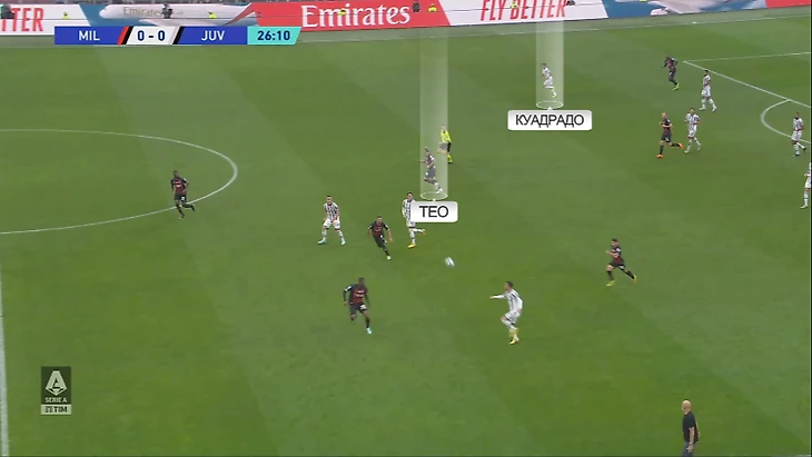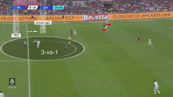 В прессинге Пиоли поменял роли Леау и Тео. «Милан» отказался от идеи давить на пару центральных защитников «Юве». Теперь по ним действовал только Жиру – Леау сразу откатывался к Данило. По цепочке перестал высоко выдвигаться и Тео – теперь француз мог сосредоточиться на Куадрадо: