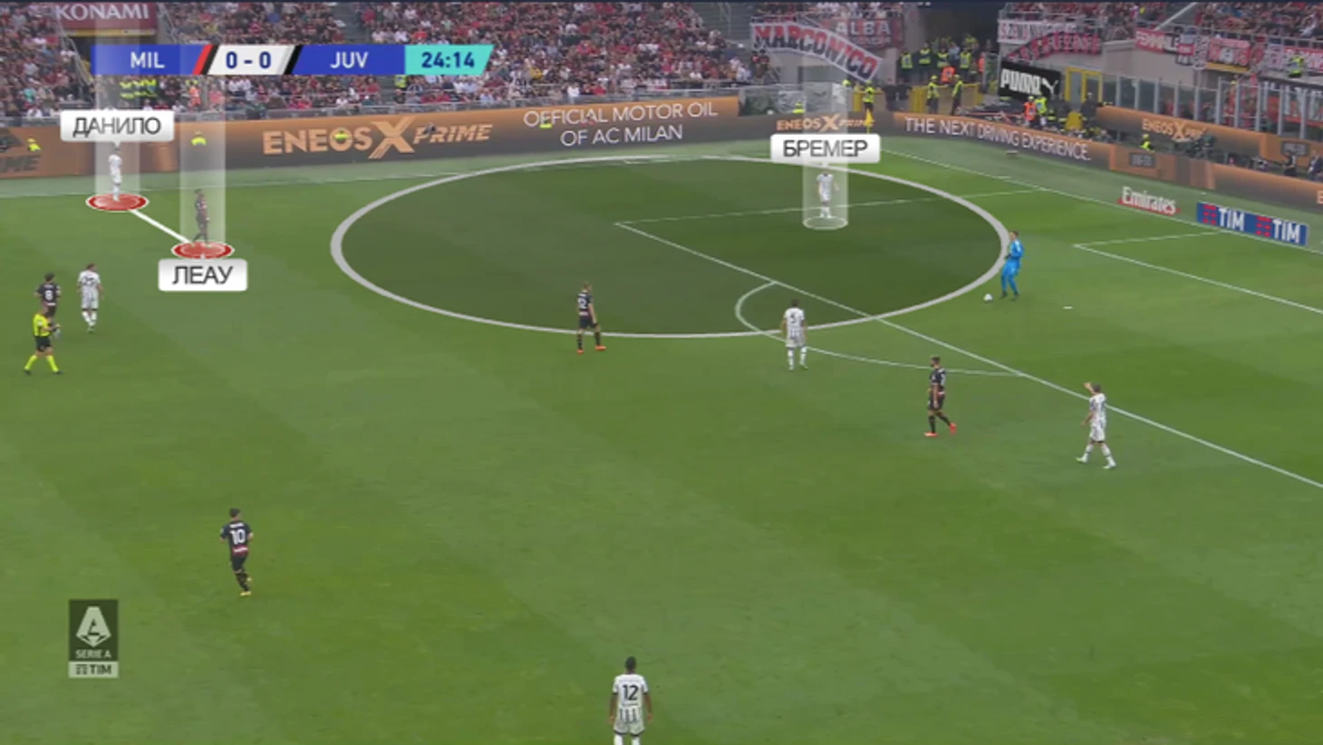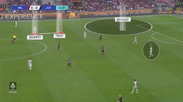 Начнем с первой – прессинг «Милана». В этой стадии хозяева пытались смело накрывать пару центральных защитников «Юве»: Жиру играл по Бонуччи, Леау оставлял фланг и играл по Бремеру. Из-за этого свободу регулярно получал Данило. Тео приходилось решать – либо выдвигаться на бразильца (но оставлять зону и Куадрадо), либо давать ему свободу.
