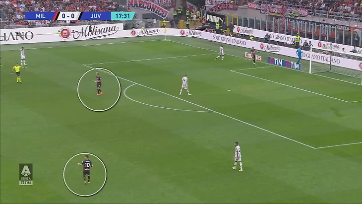 Из-за того, что глубоко располагались оба крайних защитника (и Калулу, и Тео) вингеры «Милана» оставались без поддержки. Частым сценарием были ситуации 1-в-2 у Леау и Диаса. Это напрямую ударило по остроте атак «Милана» – первый удар из штрафной с игры хозяева нанесли только во втором тайме (гол Браима).
