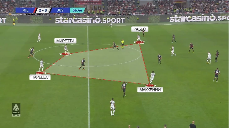 В четверке полузащитников остались только центрхавы – в середине была пара Паредес + Миретти, ближе к флангам действовали Маккенни и Рабьо. Общей темой стали попытки «Юве» разыгрывать численный перевес в центре поля – логично с таким наполнением полузащиты. Иногда даже получалось создавали хорошие условия и выводить лишнего на пространство: