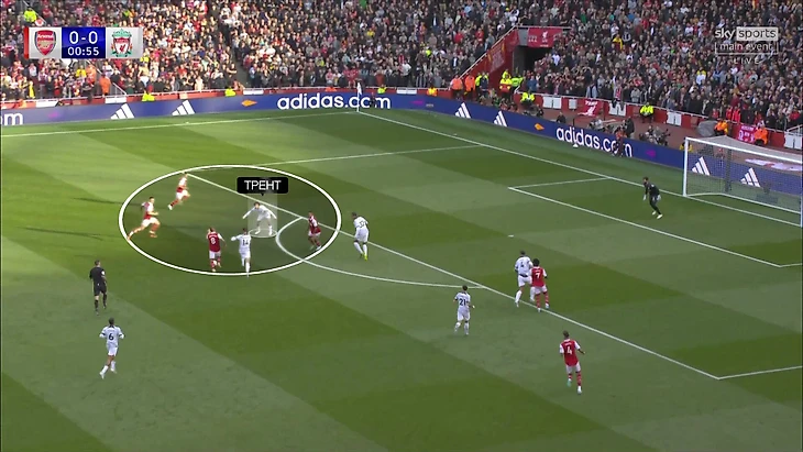 В первом голе Александер-Арнолд действительно крайне нелепо пытался перехватить пас, а не доигрывал эпизод с Мартинелли (постфактум, конечно, всем очевидно, как надо было), но реальная проблема в соотношении в пользу «Арсенала» в этой зоне – 4-в-1 или минимум 2,5-в-1. Трент выбирал между плохими решениями, пускай и выбрал очень плохое: