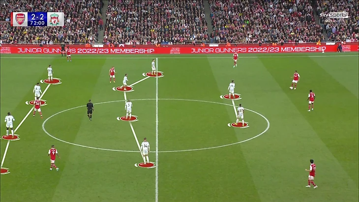 9. В отрезок контроля «Ливерпуля» «Арсенал» интересным образом адаптировал схему при позиционной обороне. Команда опасалась ситуаций 4-в-4 в случае быстрой доставки мяча в атаку и создавала импровизированную пятерку.
