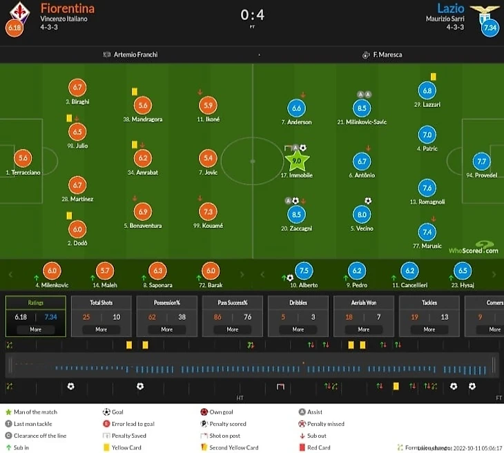 Также лучшим игроком матча по версии WhoScored признан ⭐ Чиро Иммобиле, но стоит отметить, что в целом всей команде матч удался, я думаю смело можно было всех шестерых назвать игроками матча, но не стоит забывать, что для Чиро этот матч особенный ведь он забил свой 188-й гол в Серии А в своём 300-м матче чемпионата. Только Гуннар Нордаль и Джузеппе Меацца забили больше него при одинаковом количестве матчей - 225 и 201 гол соответственно. Также Иммобиле сравнялся по количеству голов с Алессандро Дель Пьеро, с которым делит одиннадцатую строчку в общем рейтинге бомбардиров итальянского первенства, и теперь только один забитый мяч отделяет Чиро от попадания в первую десятку.