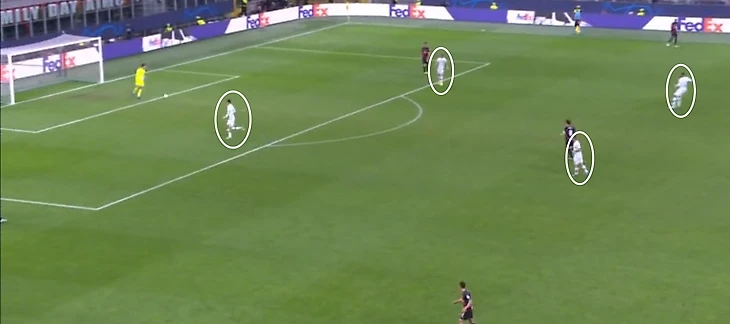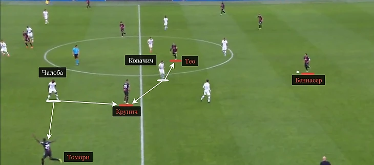 До удаления тактика «Милана» строилась на двух составляющих. Под атаку Стефано Пиоли выдумал сложную роль Тео Эрнандеса. Француз смещался с левого фланга в опорную зону. С одной стороны, благодаря фуллбэку хозяева сохраняли трех игроков в центре, даже если один из хавбеков поднимался в финальную треть или спускался в защитную. С другой, рывки крайка смущали защиту «Челси».