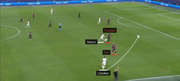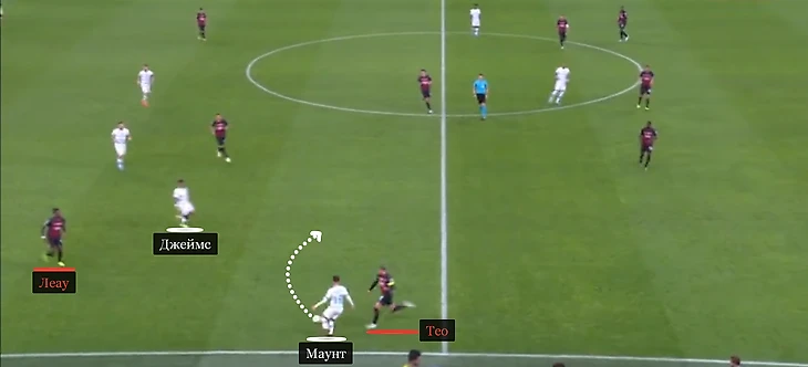 «Челси» отыскал первую лазейку в чужой системе на 8-й минуте. Гости вышли из-под прессинга с помощью стеночки между Джеймсом и Мэйсоном Маунтом. Тео и Рафаэл Леау оставили пространство на фланге.