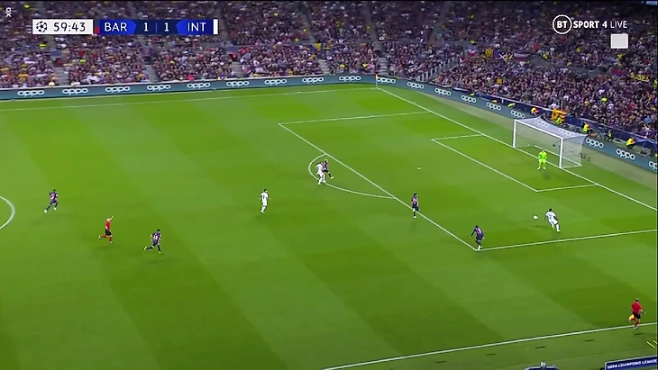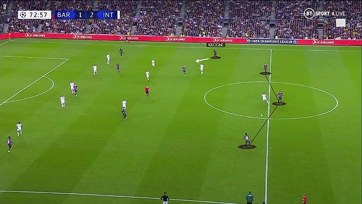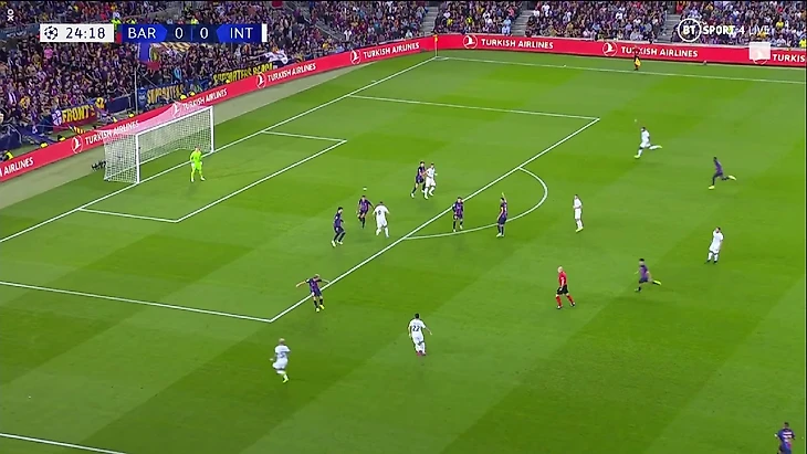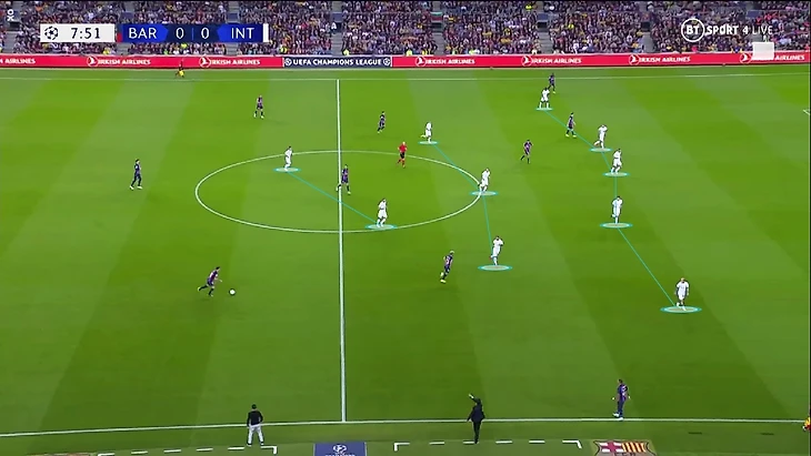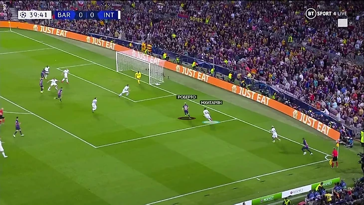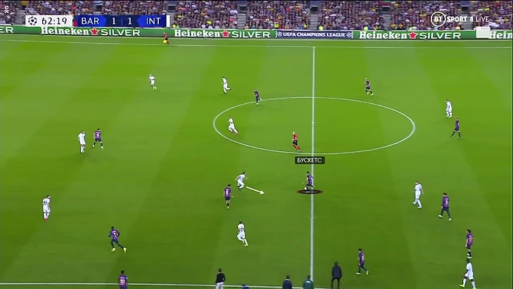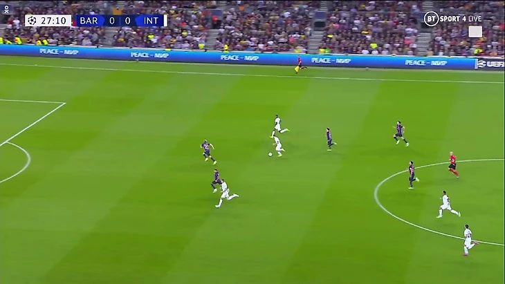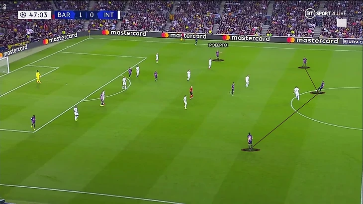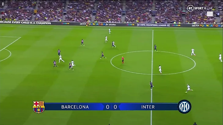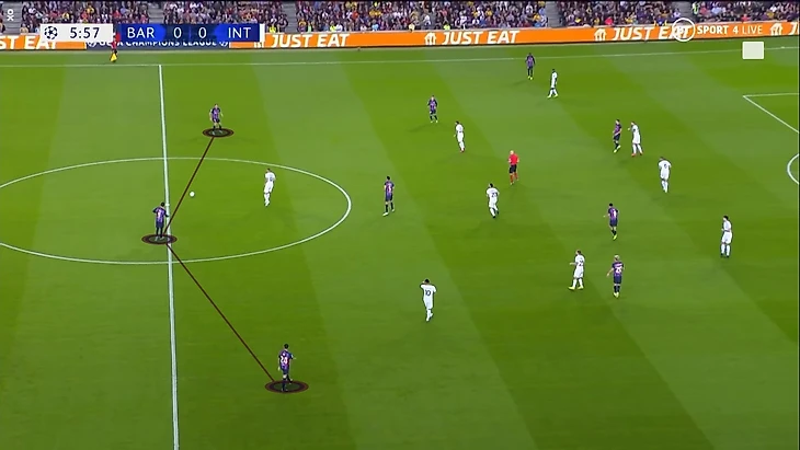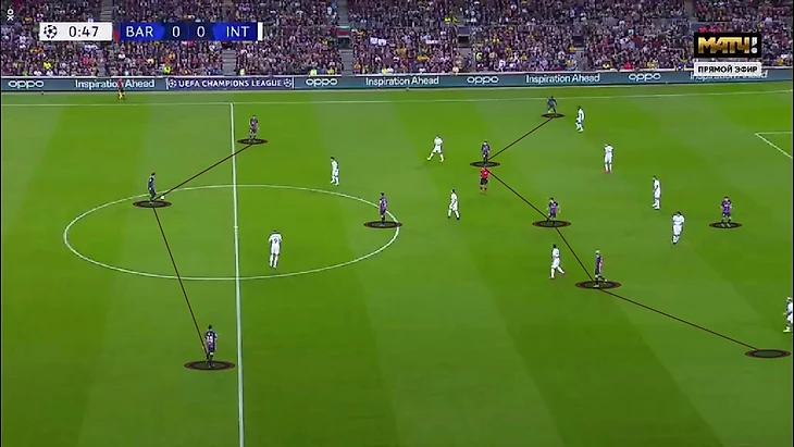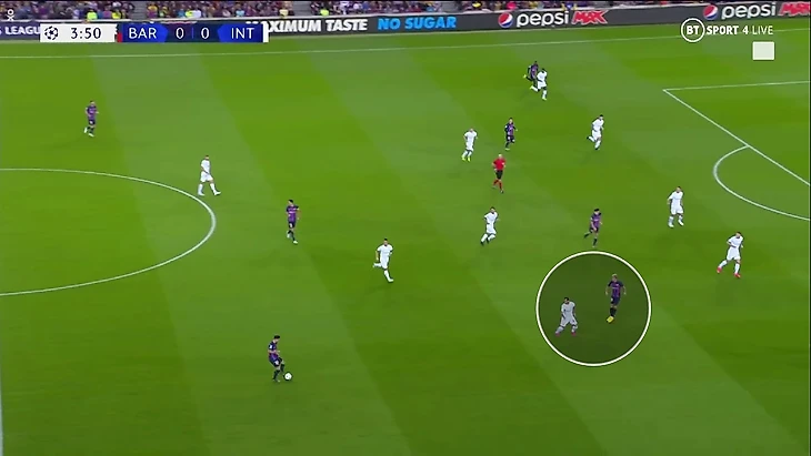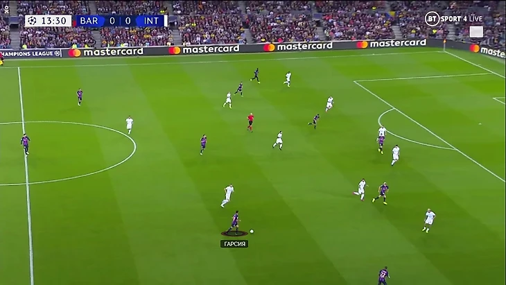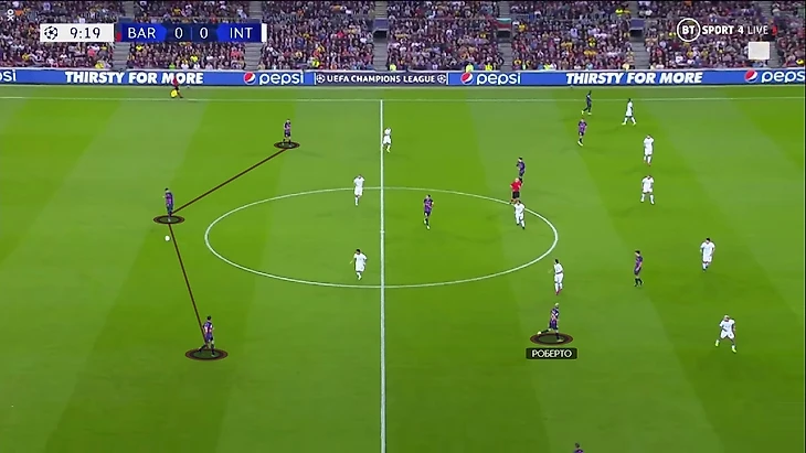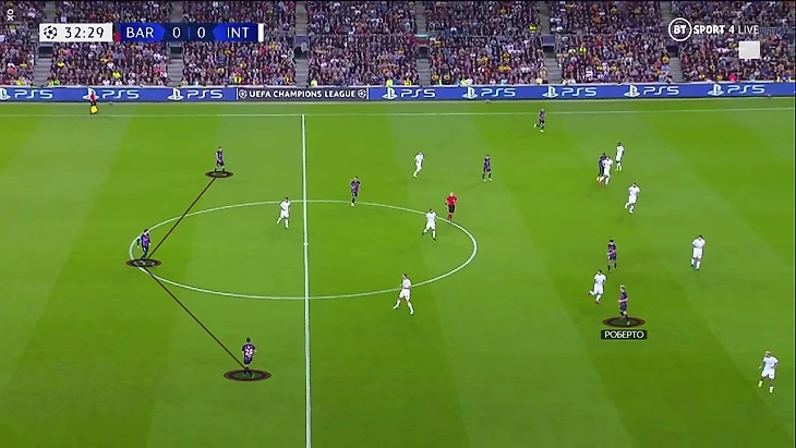 Помимо открытости такого варианта, в нём есть ещё одно решение проблемы из первой игры – теперь у «Интера» не было преимущества на правом фланге. В первом матче благодаря работоспособности Мхитаряна «Интер» регулярно создавал ситуации 2-в-1 справа, благодаря чему все три центральных защитника «нерадзурри» могли оставаться в штрафной и сосредоточиться на работе с бесконечными навесами «Барселоны». Теперь же Мхитаряну пришлось играть по Серджи Роберто:
