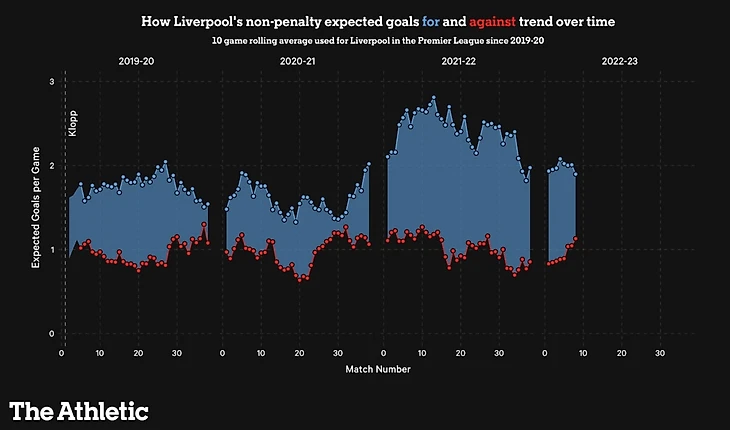 Баланс в центре поля выглядел неправильным, что только усугубляло проблемы, когда Александер-Арнолд перемещался вперед и вглубь поля, и когда Салах, по неясным причинам, проводил так много времени, прижимаясь к боковой линии, вместо того, чтобы работать в правом коридоре, где он сеет хаос. Они забивали голы сериями — девять в ворота «Борнмута», семь в ворота «Рейнджерс», — но их количество ожидаемых голов без учета пенальти резко упало, до менее 2,0 за игру, точно так же, как их количество ожидаемых голов в ворота «Рейнджерс» неуклонно росло.