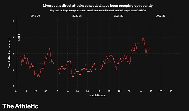 В этом сезоне все было по-другому. Какими бы невдохновленными они временами ни выглядели во владении мячом, им не хватало прежней сплоченности и плавности, самой большой проблемой была их слабость игры без мяча. Один соперник за другим — «Фулхэм», «Манчестер Юнайтед», «Наполи», «Брайтон энд Хоув Альбион», «Арсенал», даже «Рейнджерс», забивший первый гол в матче на «Айброксе» в среду вечером, — прорезали оборону «Ливерпуля», как горячий нож сквозь масло. Этот график демонстрирует количество «прямых атак», которые «Ливерпуль» пропустил в Премьер-лиге, охватывая в среднем десять игр с начала сезона 2019/20.