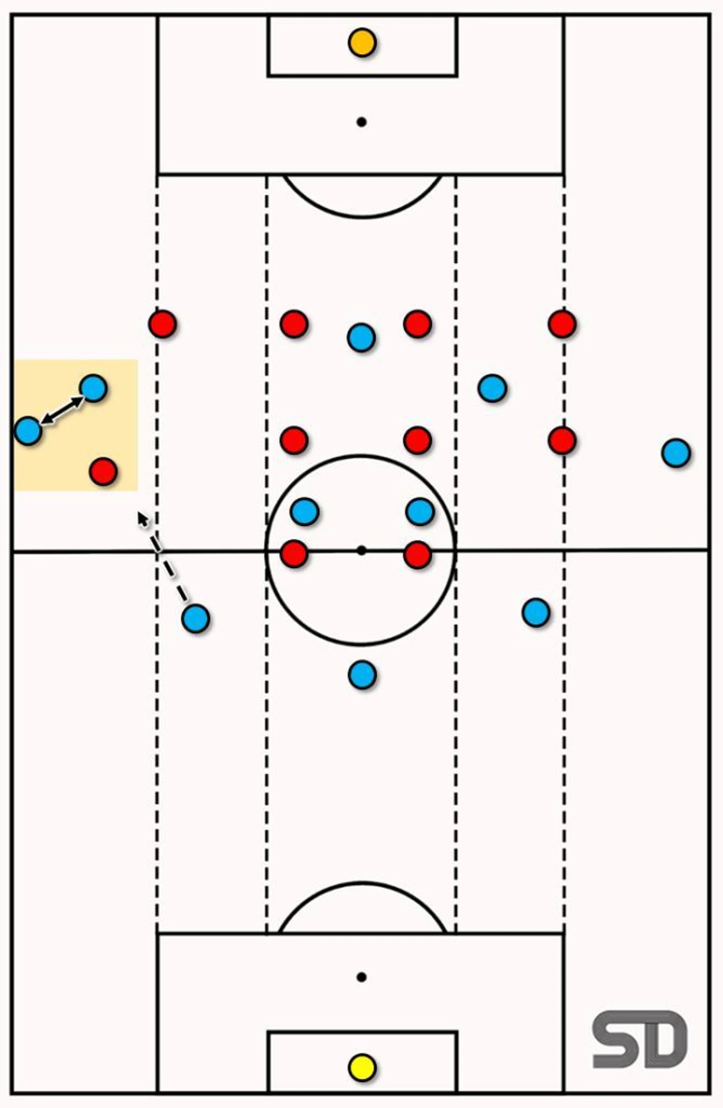 Применяется на слабом фланге. Длинная палочка буквы Т представляет линию раздела защитника и нападающего и показывает точки, в которых защитник может этого нападающего закрыть, если ему будет выполнена передача.