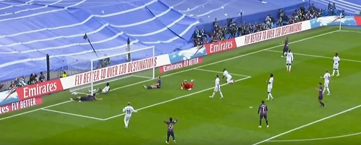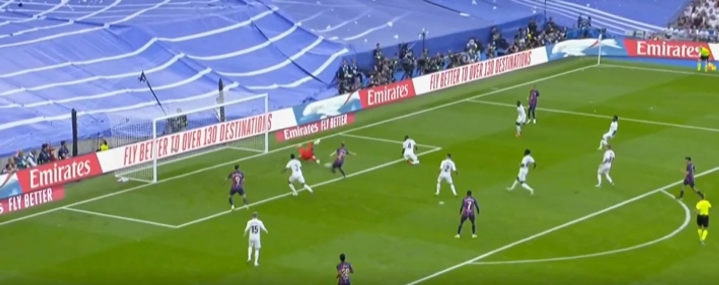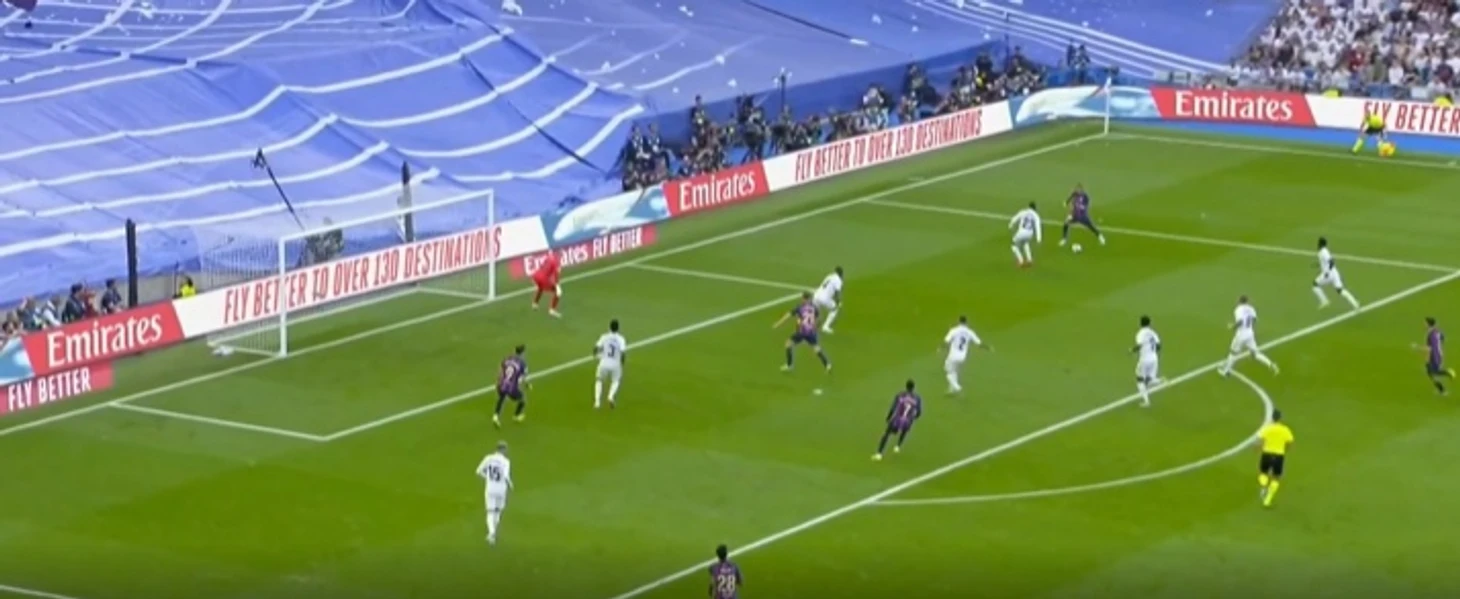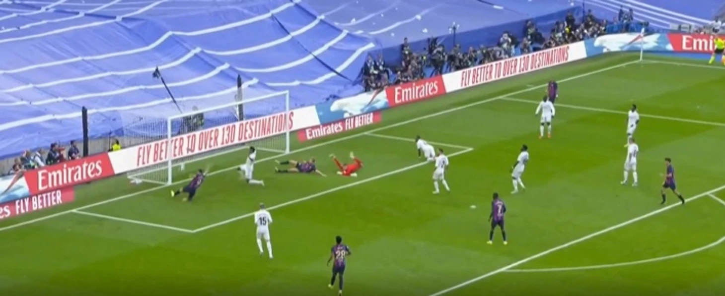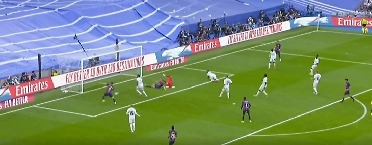 Педри из центра поля сделал передачу на Серджи Роберто, который в свою очередь отправил мяч Рафинье. Тот в падении прострелил на Левандовски, а польский нападающий в считанных сантиметрах от ворот, тоже падая, отправил мяч выше ворот, которые были абсолютно пусты на тот момент.