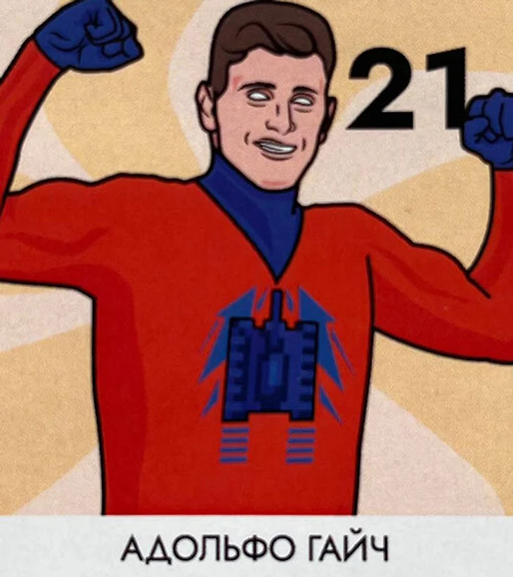 У Адольфо Гайча прозвище «Танк», поэтому у него танк на груди. А еще он самый большой, даже на наклейку не влезает.