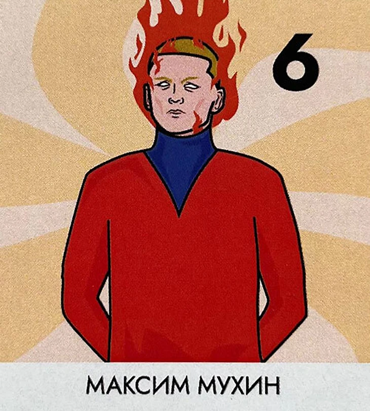 Мухина рисовал по своим ощущениям его игры. Мне кажется, что Максим играет как сорвиголова. Очень горячий, постоянно идет в стыки. Вот и изобразил его огненным.