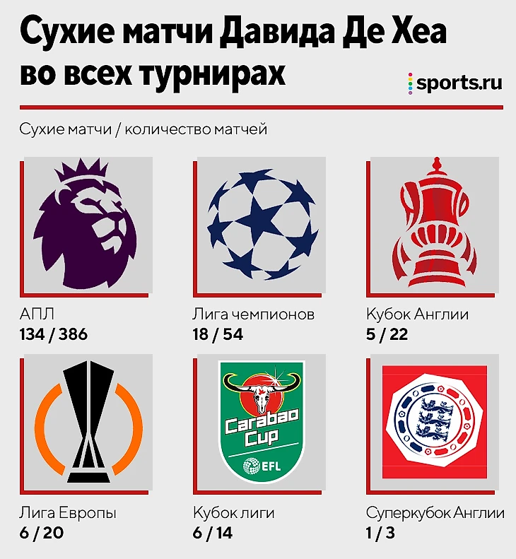 Больше всего Де Хеа пропустил от «Ман Сити» – 50 голов за 11 лет. Больше всего матчей на ноль – против «Ливерпуля» (8). Текст о голкипере не может существовать без статистики сухих матчей по турнирам. А вот и она.