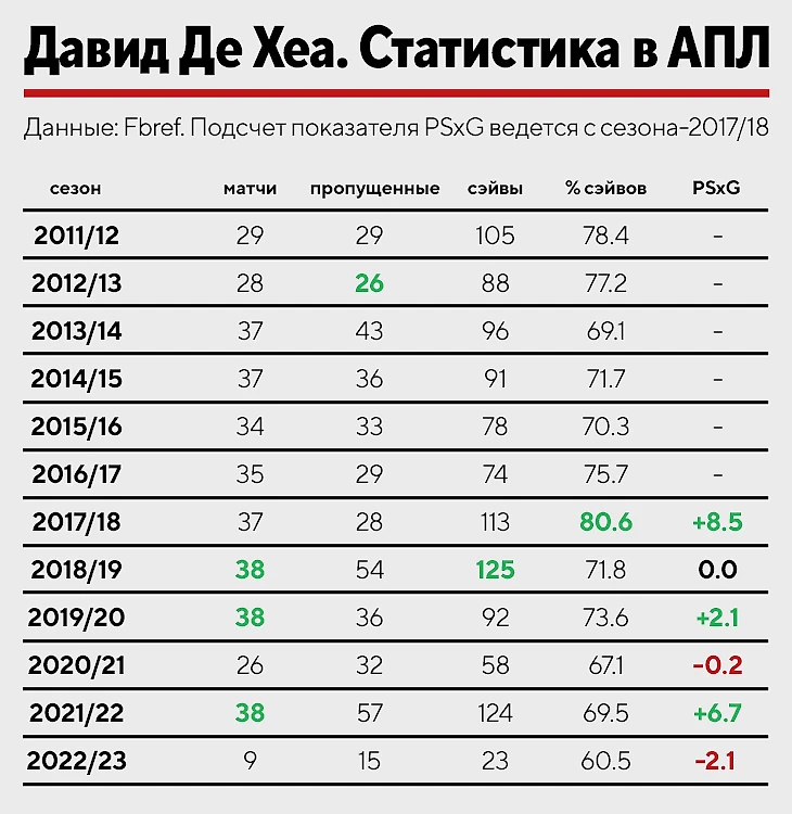 • Меньше всего пропущенных – в последнем сезон Фергюсона (и единственном чемпионском для Давида), больше всего – в прошлом (увольнение Сульшера и тоска при Рангнике). • Интересно, что больше всего сэйвов Де Хеа сделал в самый нестабильный сезон в карьере (2018/19). Тогда Давид сделал четыре результативных ошибки (худший результат за 11 полных сезонов в Англии) и пропустил 54 гола (второй худший показатель после прошлого сезона). • PSxG (Post-Shot Expected Goals) – cтатистическая модель, оценивающая игру вратарей. Она учитывает качество удара (позицию, угол, количество защитников на линии) и фактический результат (был ли гол). В пиковой форме (сезон-2017/18, второе место в АПЛ и «Золотая перчатка») Де Хеа спас «МЮ» минимум от 8 голов. Кстати, в том же сезоне Давид выдал шоу-матч на «Эмирейтс».