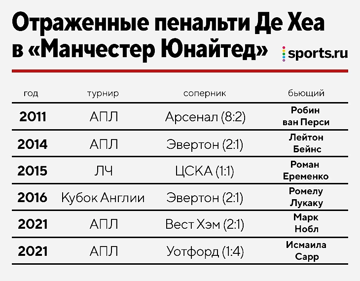 Если с игрой на линии Де Хеа справляется волшебно, то вот отраженные пенальти – явно не его сильная сторона. За 11 лет в «Ман Юнайтед» – только 6 отбитых. За два года в «Атлетико» было 5. Хотя в прошлом сезоне Давид чуть исправил ситуацию и отбил сразу два – до этого пять лет на тащил вообще ничего. Помогла новая техника игры при пенальти.