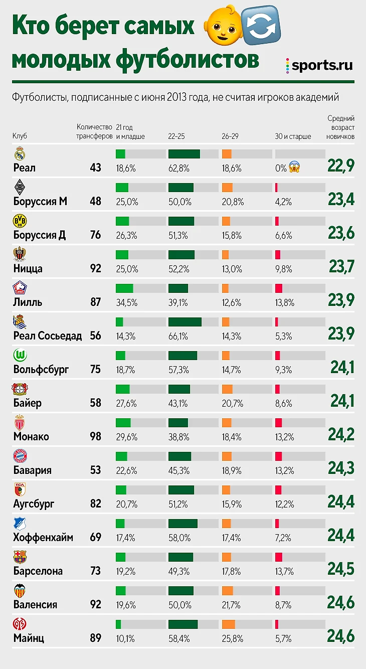 • Но в целом впереди Бундеслига: в топ-15 аж 8 немецких клубов. Обе «Боруссии» идут в тройке, а «Бавария» располагается на 10 месте: средний возраст новичков – 24,3 года.