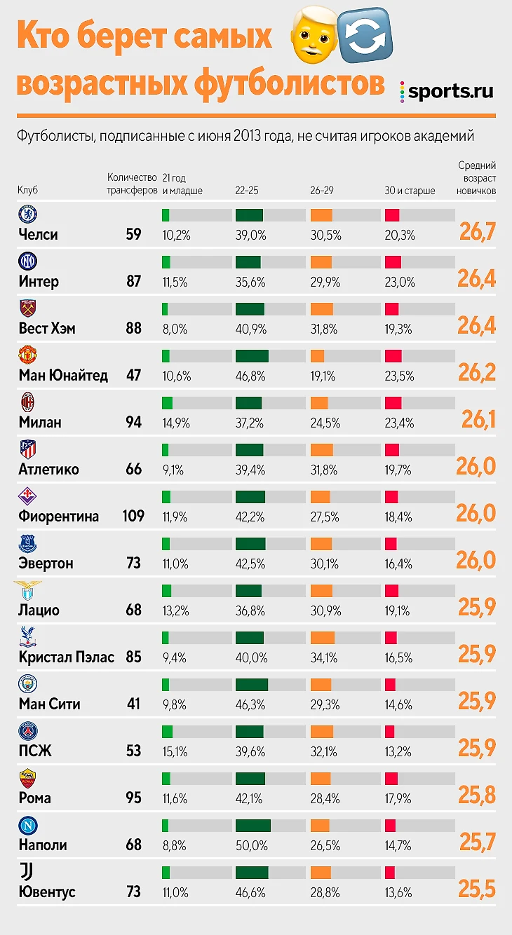 • В Англии тоже не стесняются приглашать опытных футболистов: кроме «Челси» есть «Вест Хэм» (средний возраст – 26,4), «Ман Юнайтед» (26,2), «Эвертон» (26), «Кристал Пэлас» (25,9) и «Манчестер Сити» (25,9). Итого: 6 клубов из АПЛ.