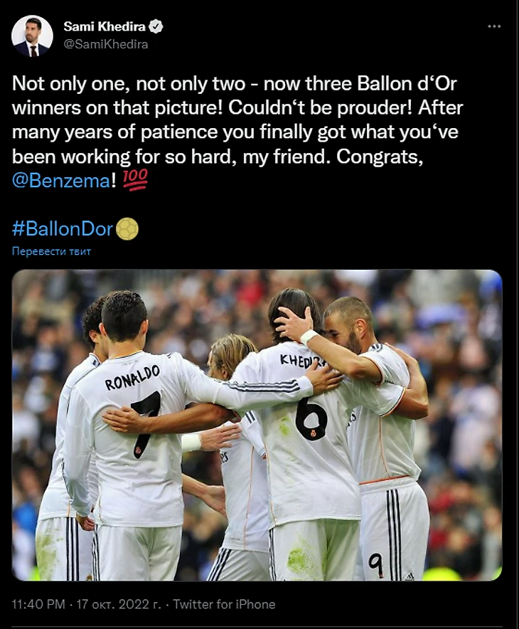 Сами Хедира. «Ни один, ни два – теперь на этой фотографии три обладателя Золотого Мяча! После многих лет терпения ты наконец-то получил то, ради чего так усердно работал, друг. Поздравляю».