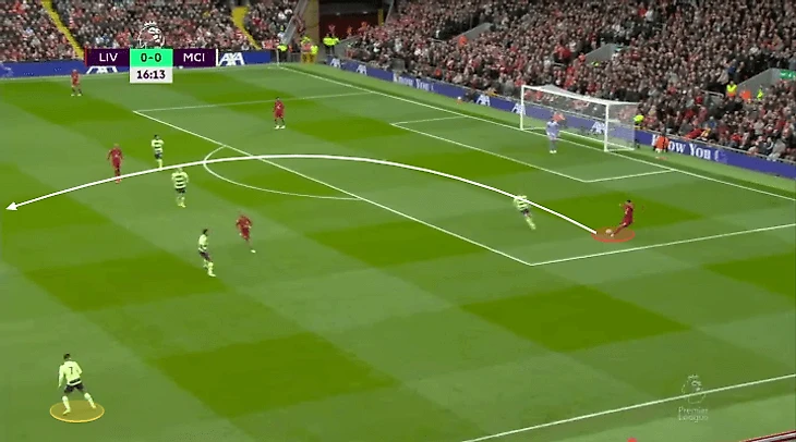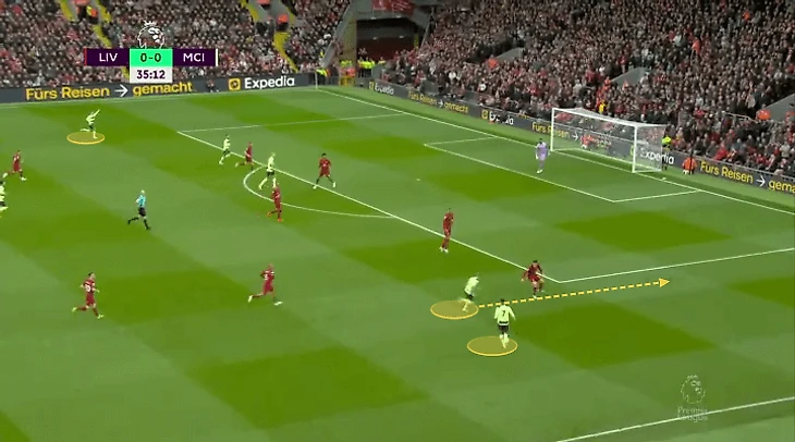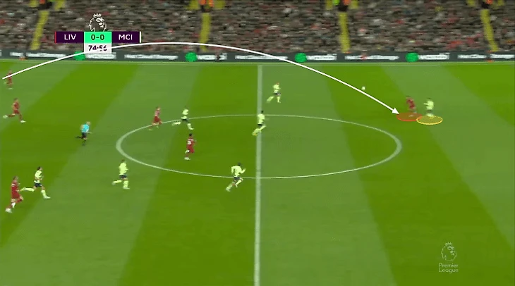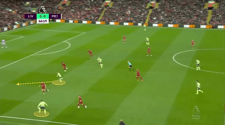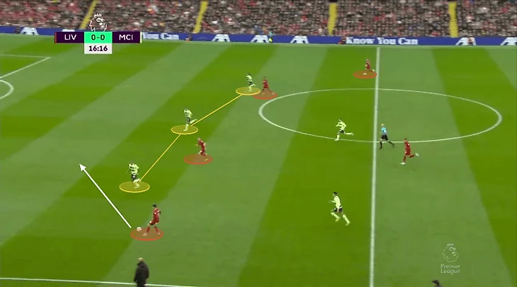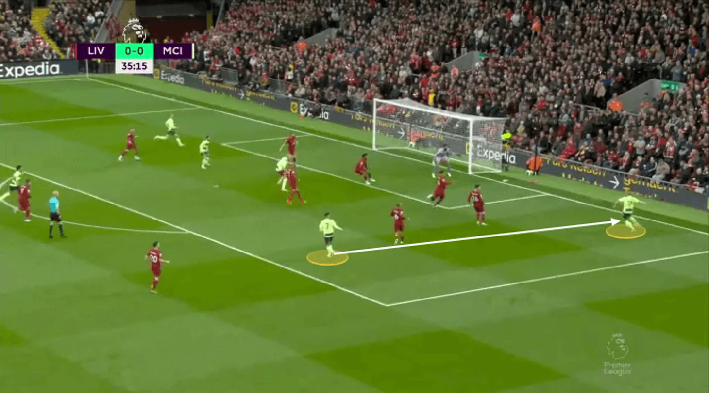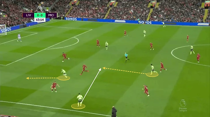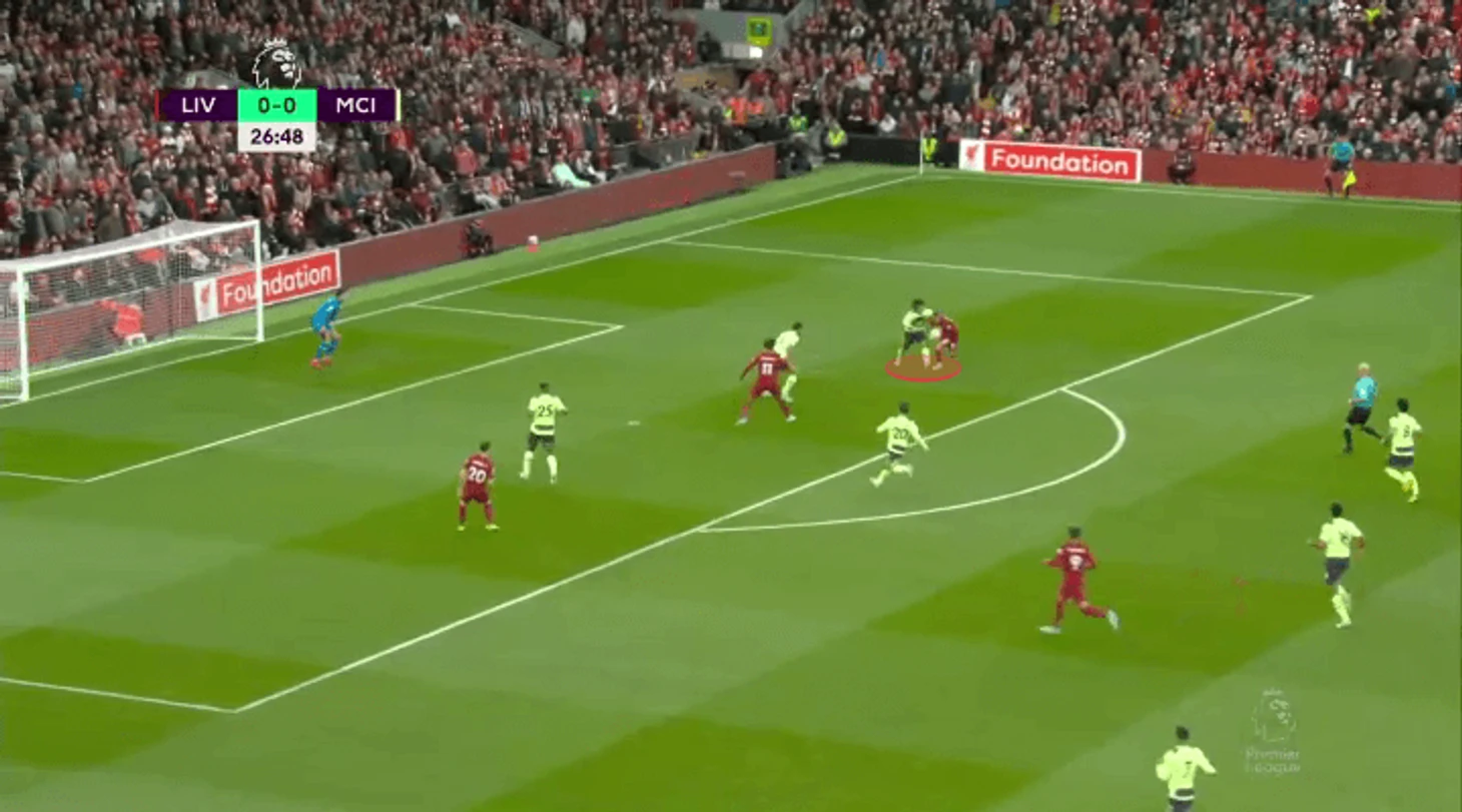 Использование «Сити» обороны из трех человек, без надлежащего флангового защитника на левом фланге, означало, что у «Ливерпуля» было достаточно места, чтобы проверять Натана Аке через фланг.