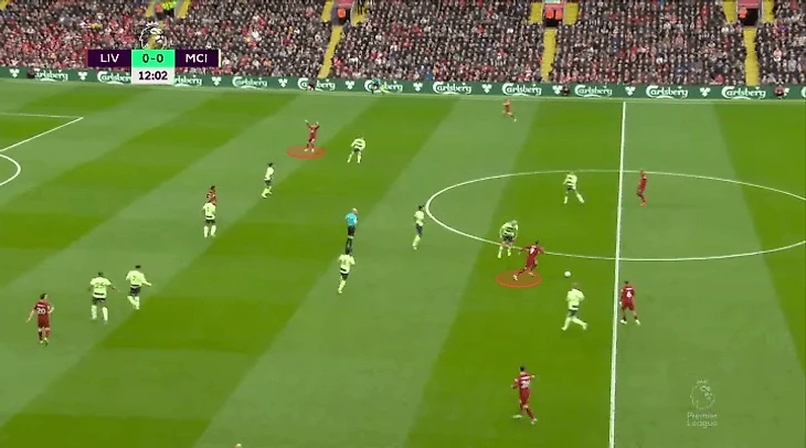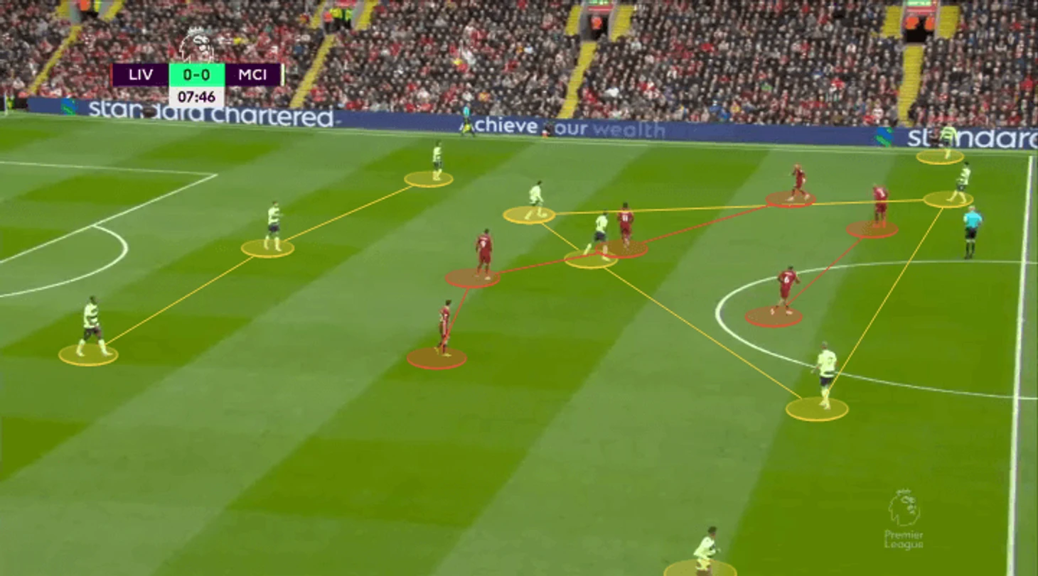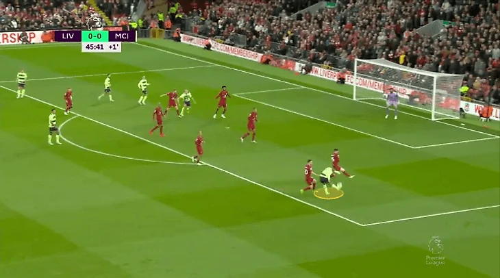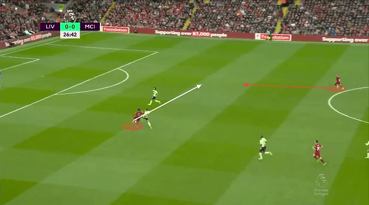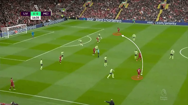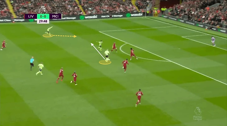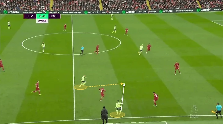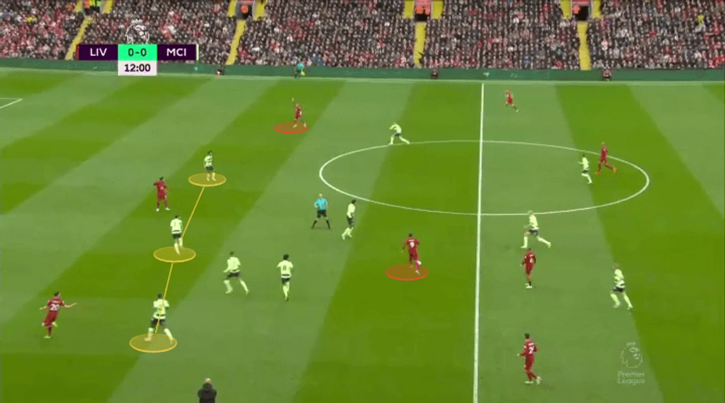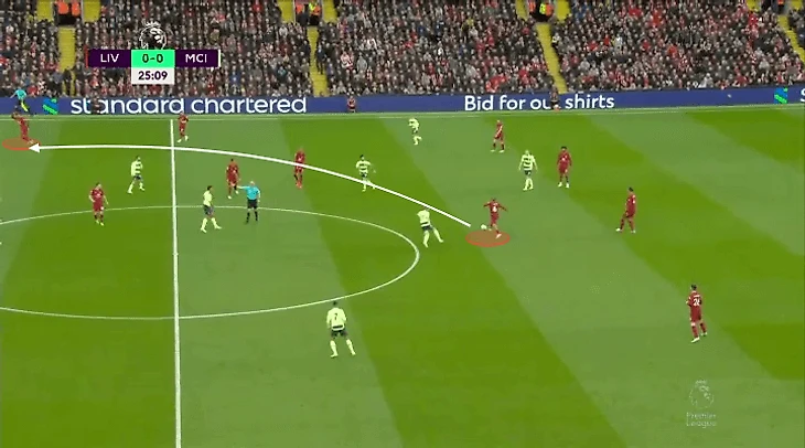 Использование «Сити» обороны из трех человек, без надлежащего флангового защитника на левом фланге, означало, что у «Ливерпуля» было достаточно места, чтобы проверять Натана Аке через фланг.