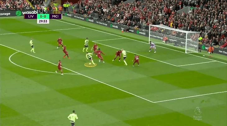 Здесь Фоден требует мяч на дальнем фланге, но единственный шанс «Сити» прорваться по правому флангу появился, когда Кевин Де Брюйне совершал свои обычные забеги на эти позиции.
