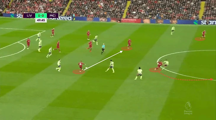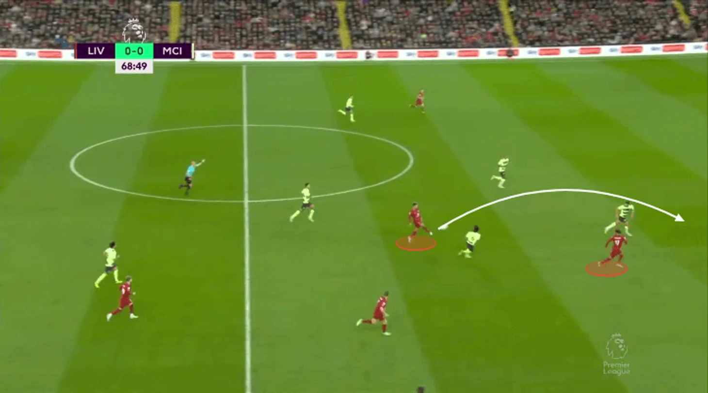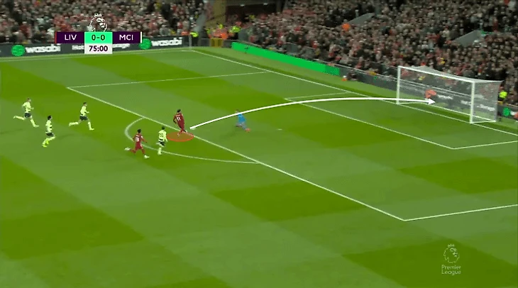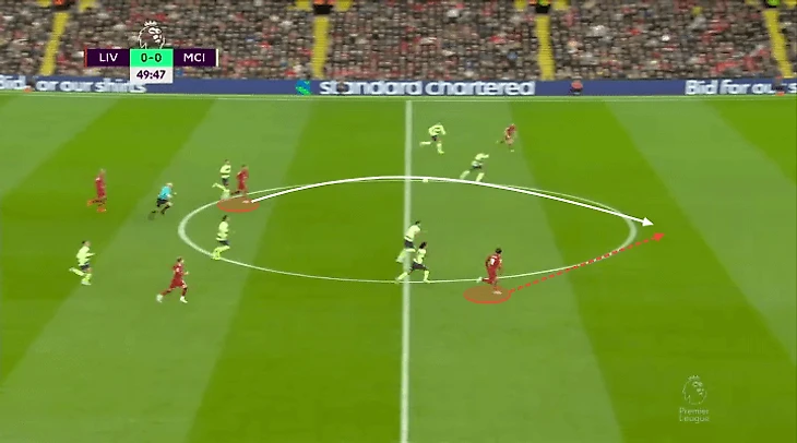 Вот другой тип комбинации, снова с участием Салаха, который пробивается справа, чтобы получить длинный пас с внешней стороны защитной тройки «Сити».…