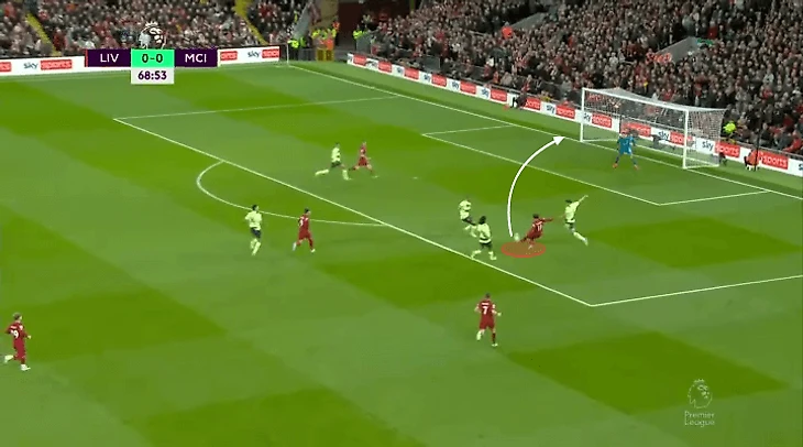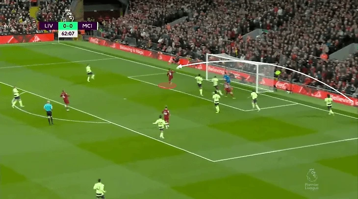Интригующе, однако, что, когда Салах перемещался на свой правый фланг, «Ливерпуль» разыграл мяч там быстрее.