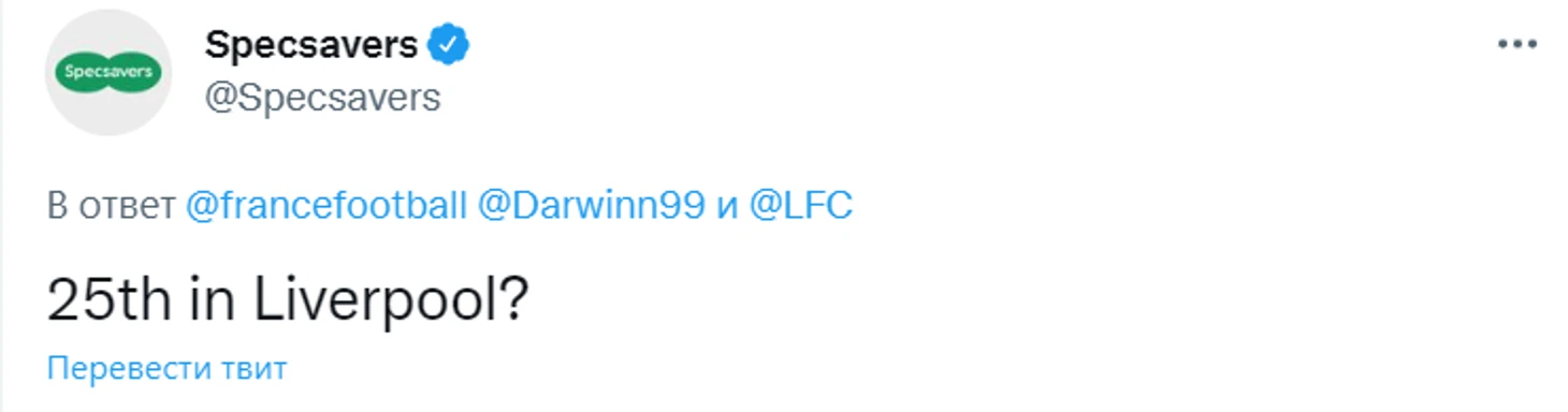 Официальный аккаунт «France Football» в Твиттере опубликовал соответствующий пост с фотографией игрока. На публикацию отреагировала компания Specsavers, которая занимается продажей очков и контактных линз. Аккаунт написал следующее: «25-ое (место − прим. Sports.ru) в «Ливерпуле»?»