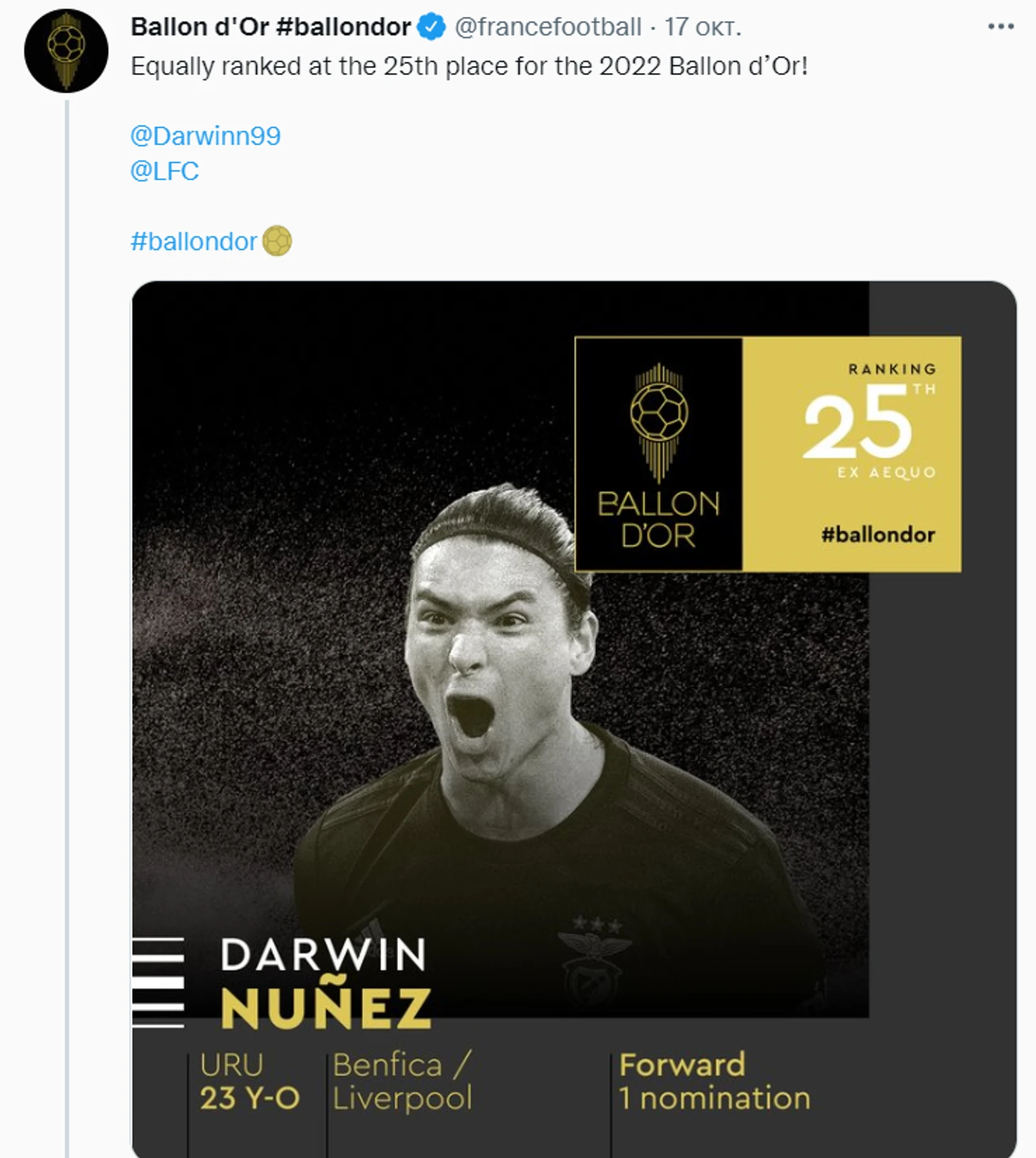 Нуньес занял 25 место в голосовании на «Золотой мяч». И нарвался на троллинг