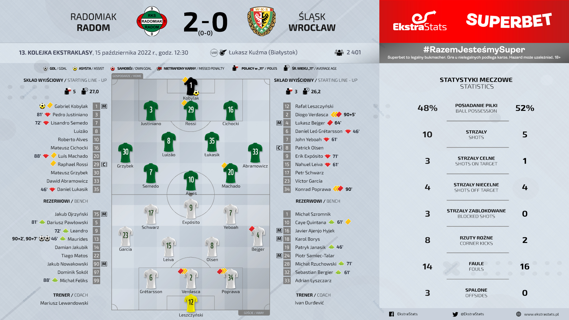 В добавленное время радомцы все же открыли счет. Мауридес проткнул мяч за линию ворот после подачи углового. Спустя полторы минуты с поля был удален третий центральный защитник вроцлавлян. Вердаска решил потолкаться с вратарем радомцем Кобыляком, за что увидел перед собой второй горчичник. Оставшись ввосьмером, гости пропустили второй мяч. Мауридес убежал один на один с Лещинским (естественно через центр обороны), переиграл голкипера вроцлавлян и поразил уже пустые ворота. После трех поражений «Радомяк» одержал победу, но сейчас эта победа ни о чем не говорит.