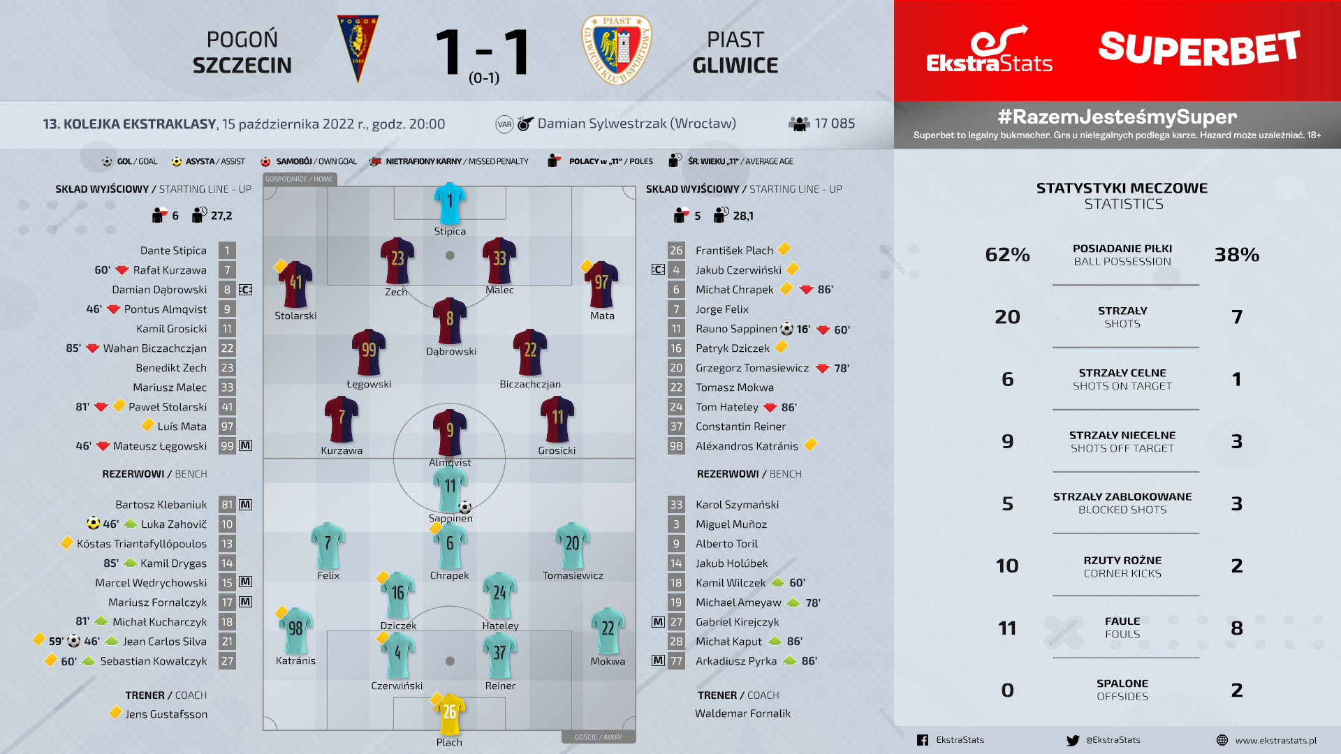 «Погонь» после поражения от «Стали» 2:4 рассчитывала исправиться перед своими болельщиками в матче с «Пястом». Ожидаемо щецинцы с первых минут матча побежали вперед, мощно по воротам Плаха пробивал Домбровски, но капитану «портовцев» не хватило точности. Гости ответили контратакой, которую точным ударом завершил Саппинен. Для эстонского форварда этот гол стал первым в футболке гливичан, несмотря на то, что матч в Щецине был для Саппинена уже двадцатым в составе польского клуба.