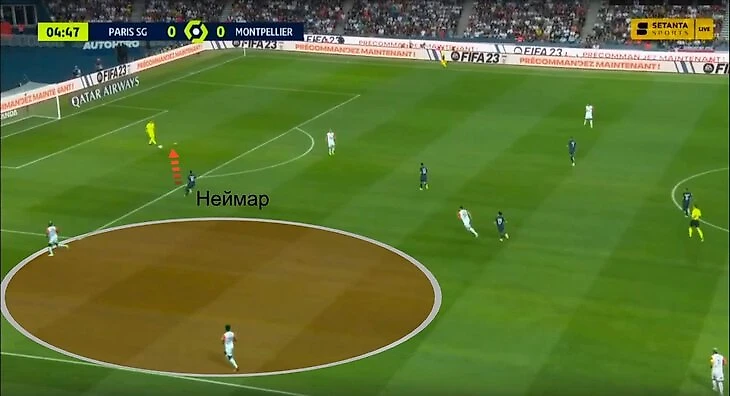 Матч с «Монпелье» очень показателен. С одной стороны, Неймар доказал, что может пахать без мяча. С другой, его оборонительная работа порой выглядела абсолютно безрассудно. Это проявлялось и в позиционных странностях (на скриншоте ниже – побежал к вратарю, оставив своего игрока на фланге, и его сразу отрезали пасом обратно), и в агрессивности борьбы (сфолил пять раз, однажды очень жестко, но явно без намеренной грубости – просто не хватает навыков отбора).